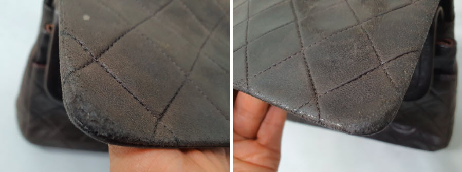 샤넬 핸드백은 덥개를 여닫는 구조인데 사용하면서 여닫거나 스치는 부분이어서 테두리의 가죽 손상이 심하게 되었습니다.