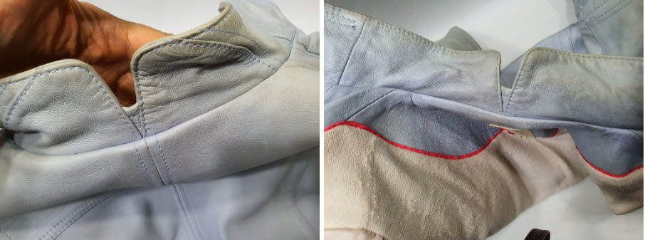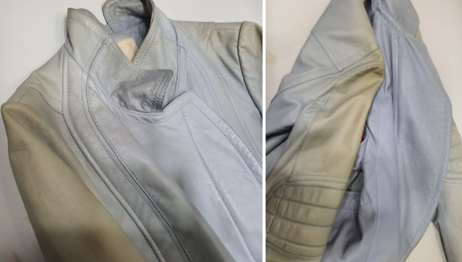 앞부분과 어깨, 소매를 비교하니 변색이 심하게 진행되고 있음을 알 수 있습니다. 가죽의 손상이나 마모가 없음에도 이렇게 변색이 되면 착용이 어렵겠네요ㅜㅜ