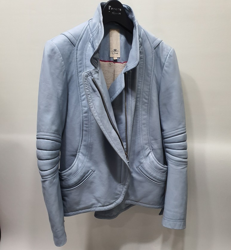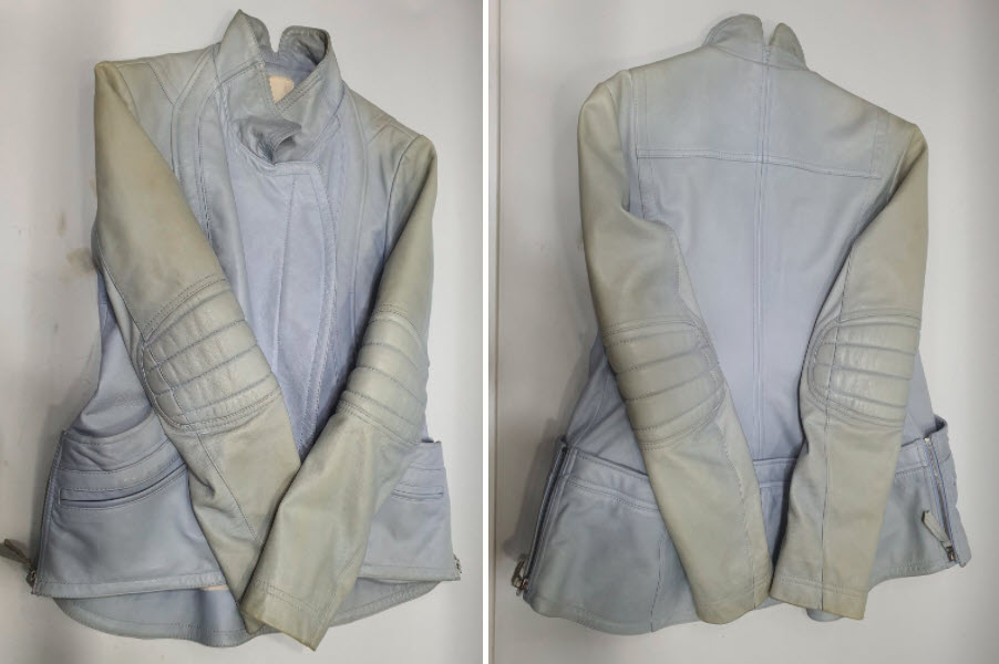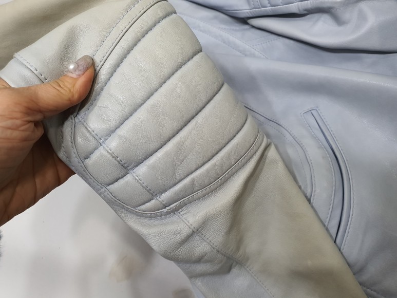맑은 하늘색이었던 자켓이었는데 변색이 심하게 되었네요. 양가죽은 침투식 염색으로 염색을 하고 가죽의 부드러움을 극대화하기 위해 코팅을 하지 않는 경우가 많아서 빛이나 산소에 계속 노출이 되면 색상이 점차 변하게 되지요.