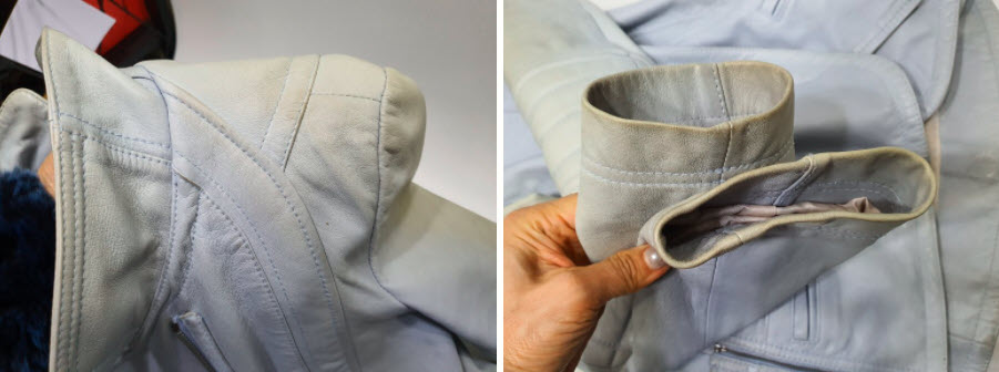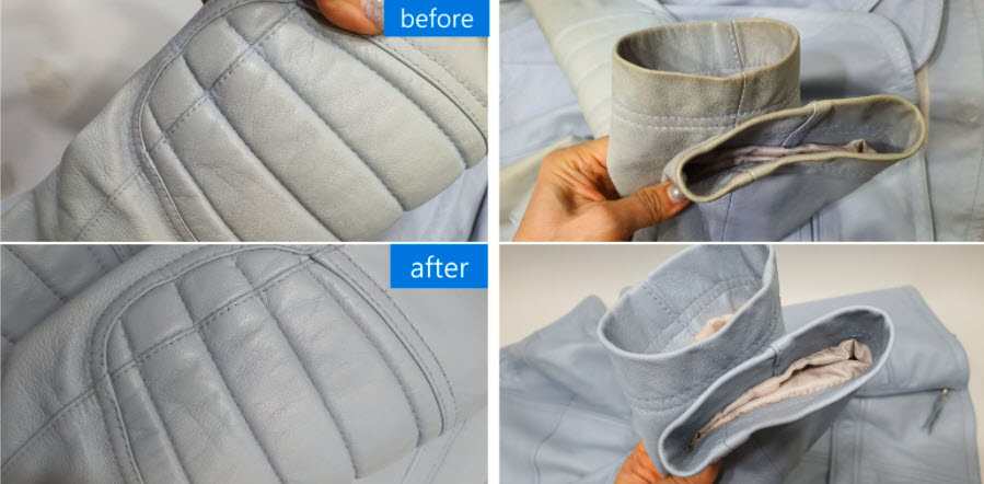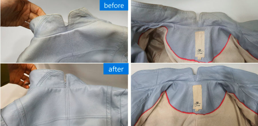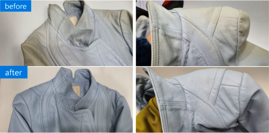 구두나 가방은 신체에 직접 착용하지 않는데다 신축성이나 얇게 염색되어야 하는 부담이 상대적으로 덜하지만 가죽의류는 사람이 입고 활동하는 것이며 대부분 양가죽이어서 처음의 상태를 최대한 유지해 주어야 합니다.