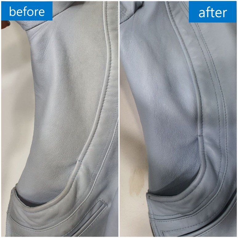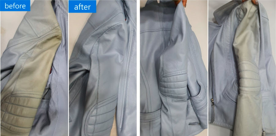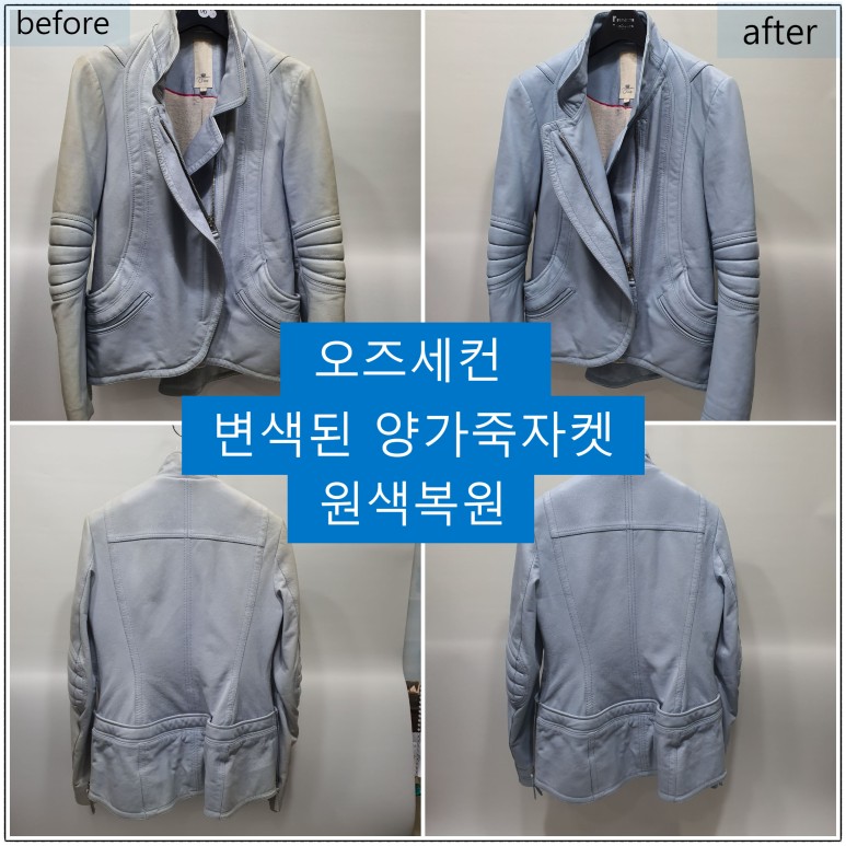 가죽손상이 없음에도 심한 변색으로 입을 수 없었던 자켓이 이렇게 멋스러운 자태를 되 찾았습니다.