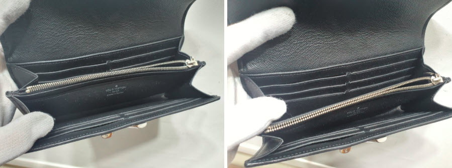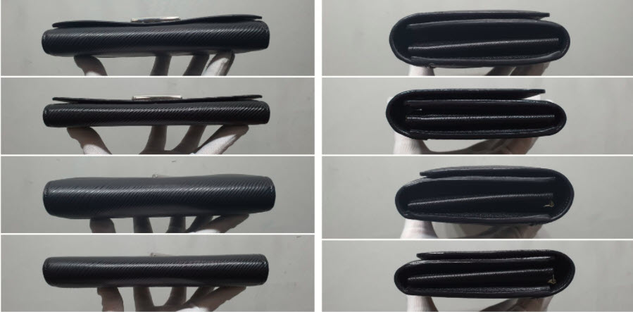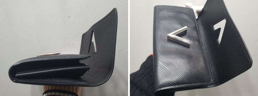 전체가 다 젖은 경우인데도 다른 가죽지갑이 외부보다 내부가 훨씬 심하게 변형되는 것과 달리 루이비통 에삐가죽 장지갑은 외부가 내부보다 더 변형되어 있습니다.