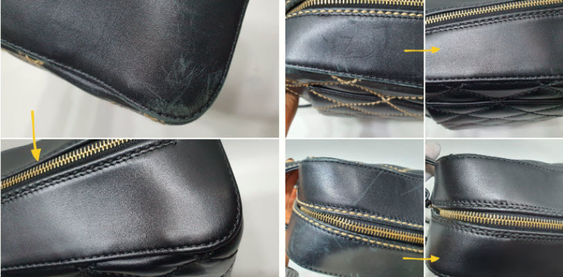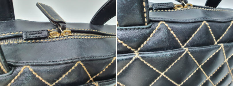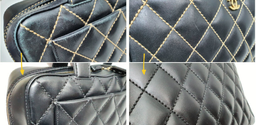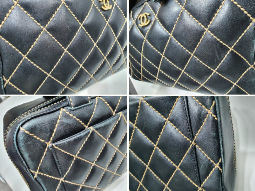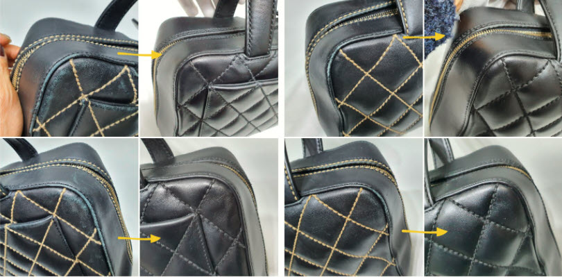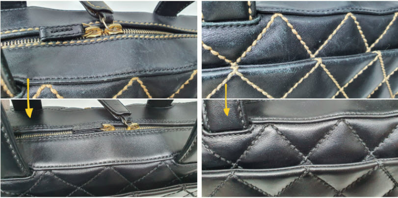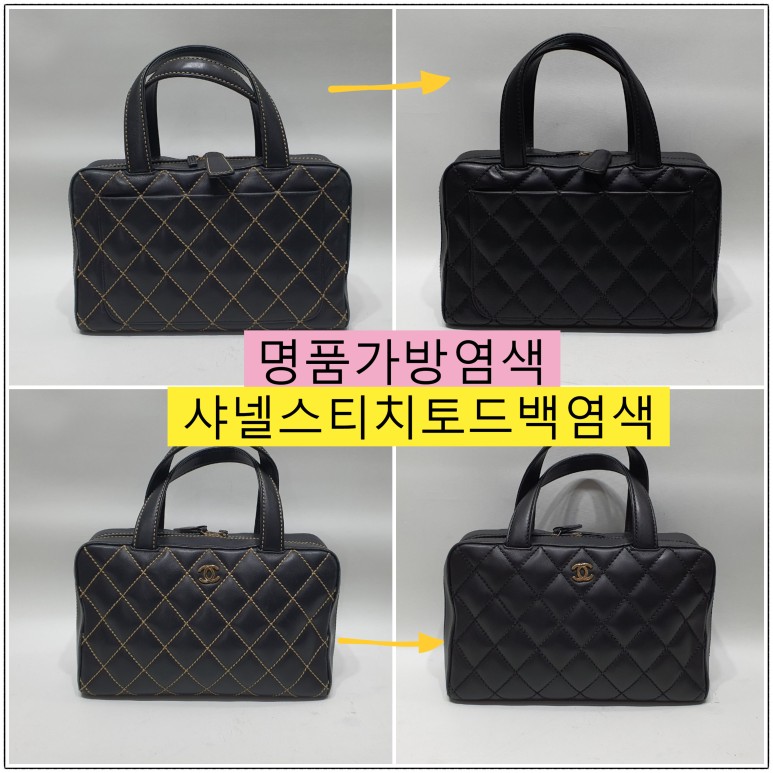 자주 애용한 흔적이 가득한 마모와 스크래치가 샤넬 스티치 토트백에 전반적으로 보이네요. 오래된 흔적도 없애고 새로운 느낌을 위해 올 블랙으로 염색하시기를 선택하셨네요~