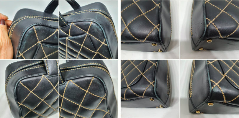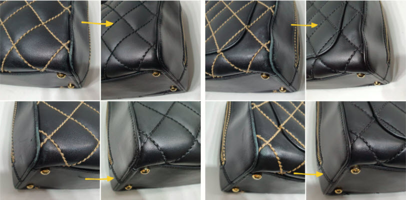 샤넬 스티치 토트백의 측면은 사각의 모양이어서인지 부딪힌 듯한 모양의 상처가 측면과 모서리에 많이 보입니다.