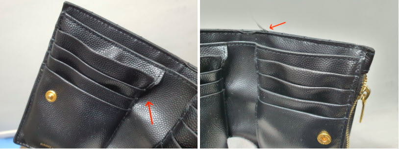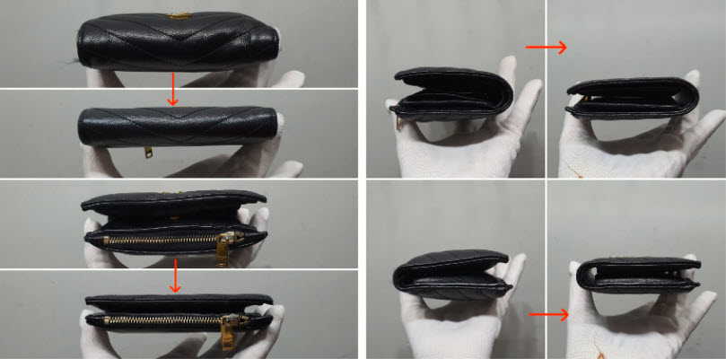 퀼팅된 모습이 자연스럽게 되도록 복원하되 내부의 모양을 반듯하게 잡아야 하므로 자칫 입생로랑 젖은 지갑 복원시에 방심하면