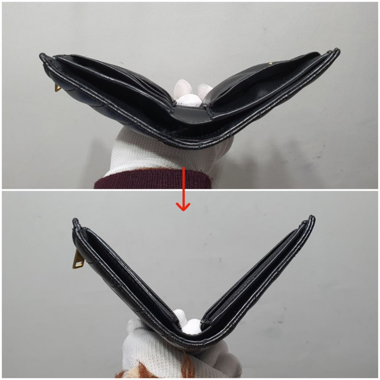 젖은지갑복원 작업에서 특히, 퀼팅지갑복원은 세심한 주의가 필요합니다. 모양을 잡을 때 퀼팅된 가죽의 쿠션이 눌리면 입생로랑 퀼팅가죽지갑의 매력이 사라지기 때문이지요.