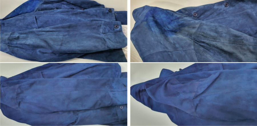 오염이 제거된 후에는 스웨이드만을 위한 염료와 염색방법을 사용하여 고르게 염색해 주어야 합니다,.