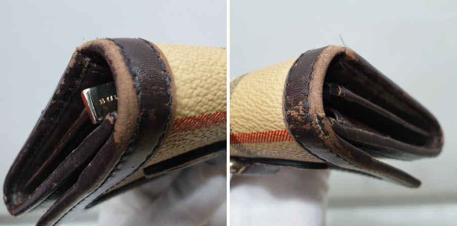 지갑은 사람 손이 가장 많이 가는 소품 중 하나로 오염과 마모가 가장 빨리 생기게 되지요. 모서리와 접히는 부분의 마모가 심각하게 훼손되었네요 ㅜㅜ