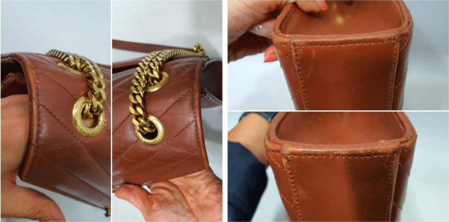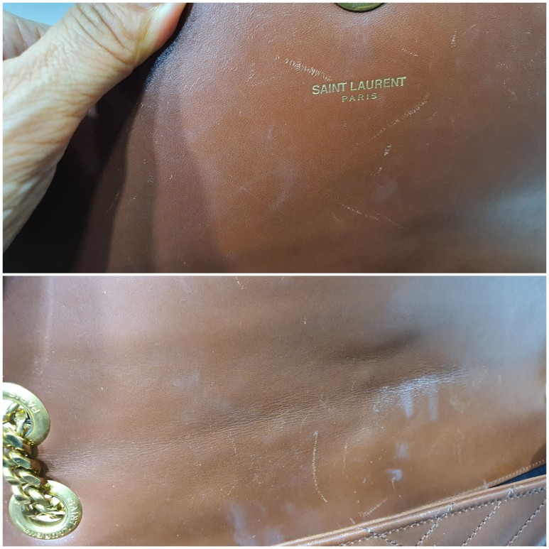 아주 정갈하게 딱 떨어지는 라인과 깨끗하고 고급스러운 이미지의 입생로랑 모노그램 사첼백인데 사용에 의한 스크래치과 낡은 느낌이 모노그램이 있는 덮개 부분에 보이고요ㅜㅜ