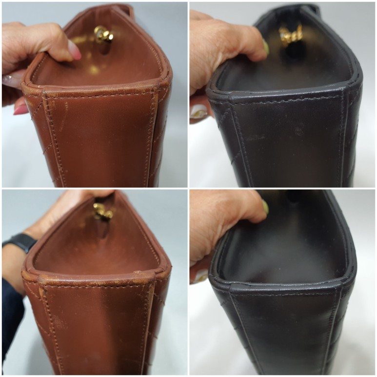 색상을 블랙으로 바꾸기를 원하셔서 클리닝을 하려고 닦았는데 이미 한 번 염색을 한 가방이네요. 밝은 브라운 색이 이렇게 드러나고 있습니다.