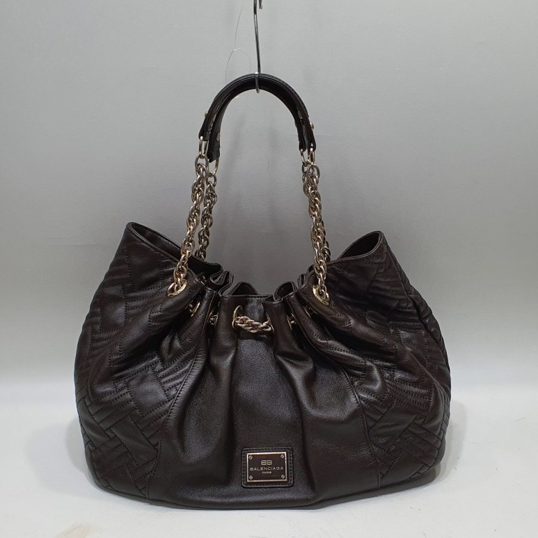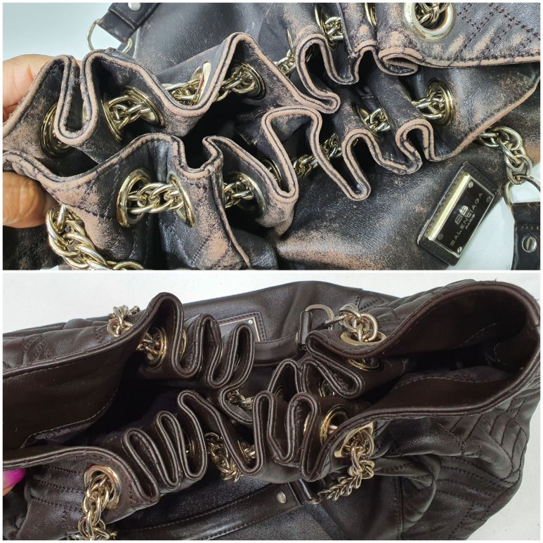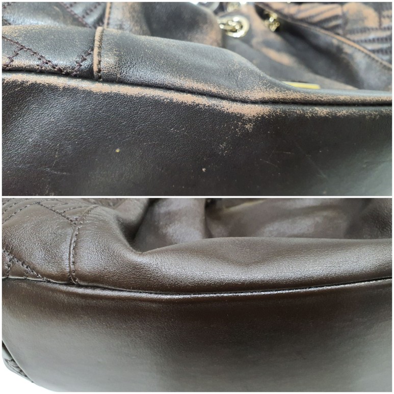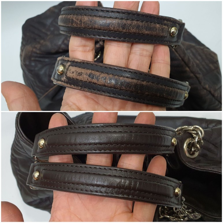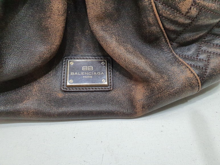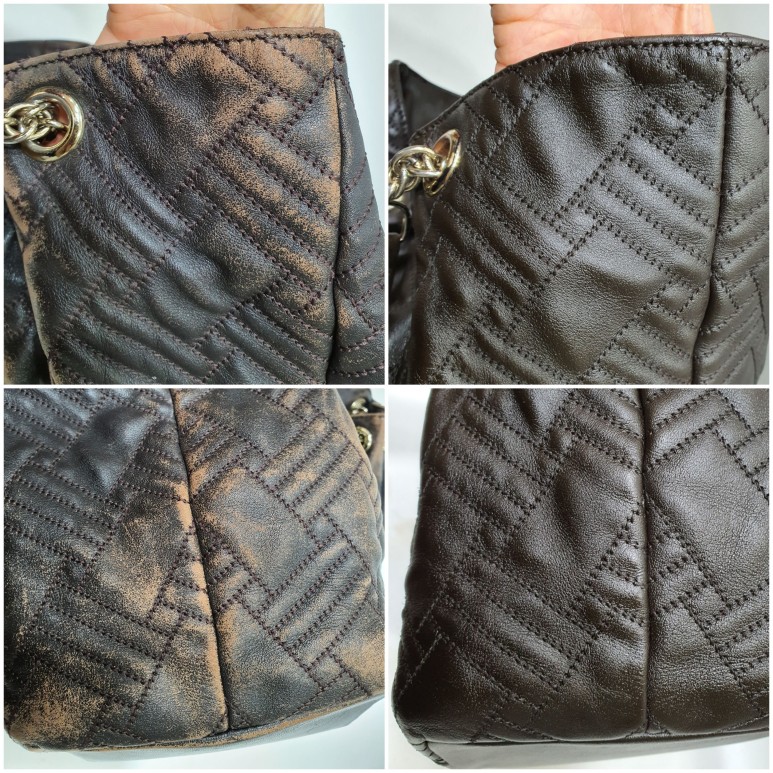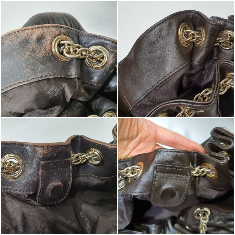 발렌시아가만의 퀼팅문양을 섞은 가죽 버킷백, 오래 사용하다보니 가죽의 색상이 벗겨지고 마모에 의해 손상도 되기 시작했네요 ㅜㅜ
