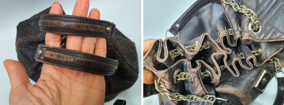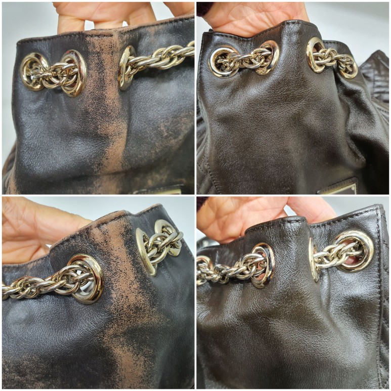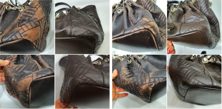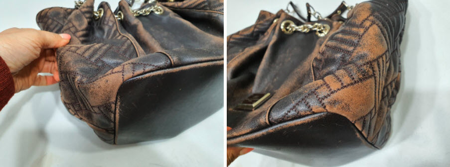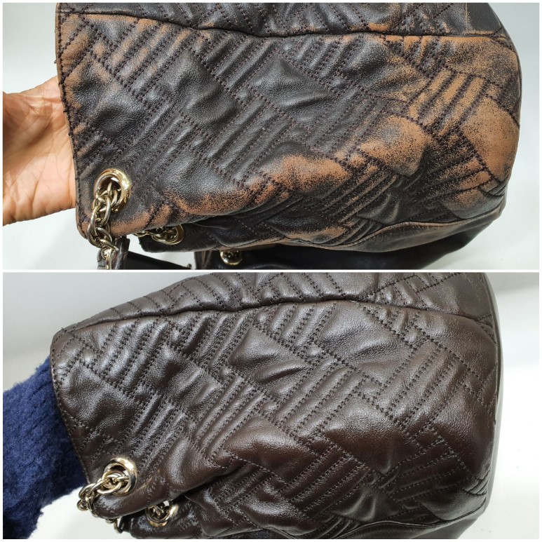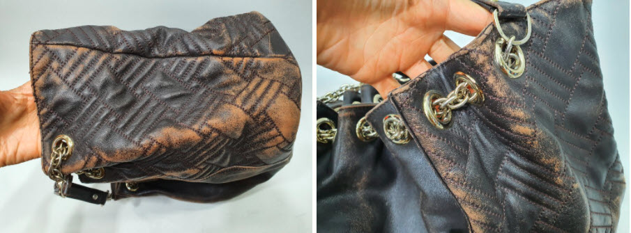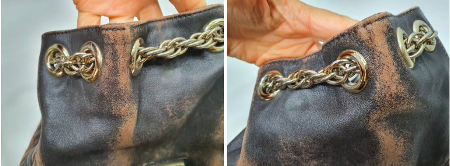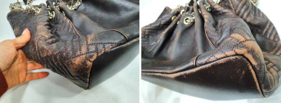 가까이보니 버킷백의 접힌 모양에 따른 마모가 확연하게 드러나네요. 자연스럽게 멋스럽게 여길 수도 있지만 이렇게 색상이 벗겨지고 나면 가죽표면은 마모가 시작되고 손상으로 이어져서 사용에 문제가 발생하게 되거든요.