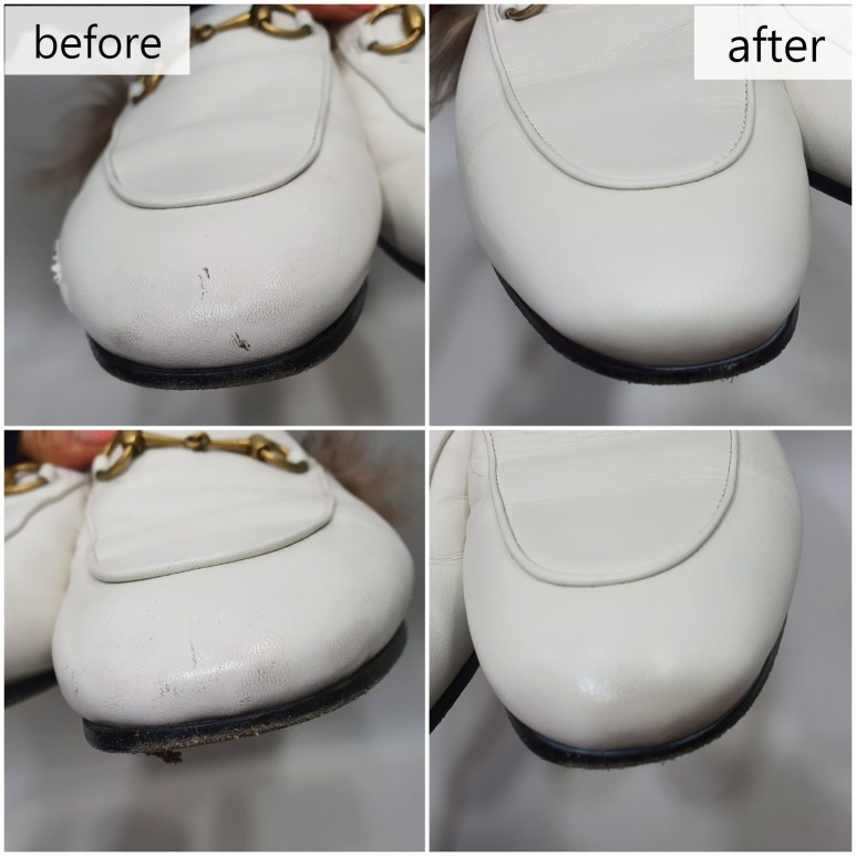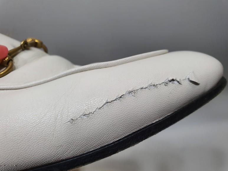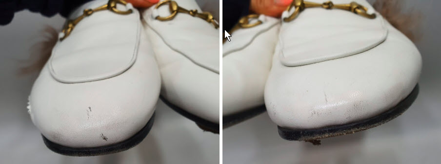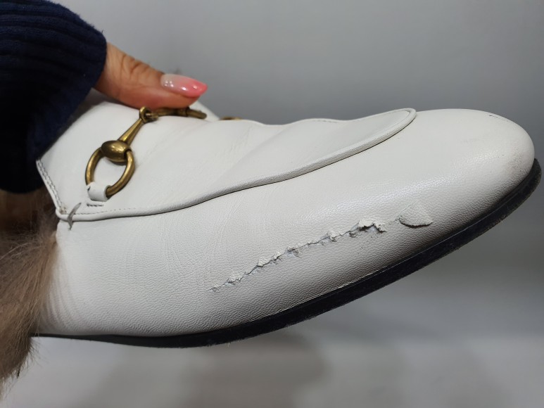 흰색 신발, 특히 양가죽으로 만든 것이면 몇 번 신지 않아도 오염이나 스크래치가 생기게 마련이죠. 예외없이 이 구찌 슬리퍼도 앞쪽에 긁힌 상처와 오염이 조금 있네요.